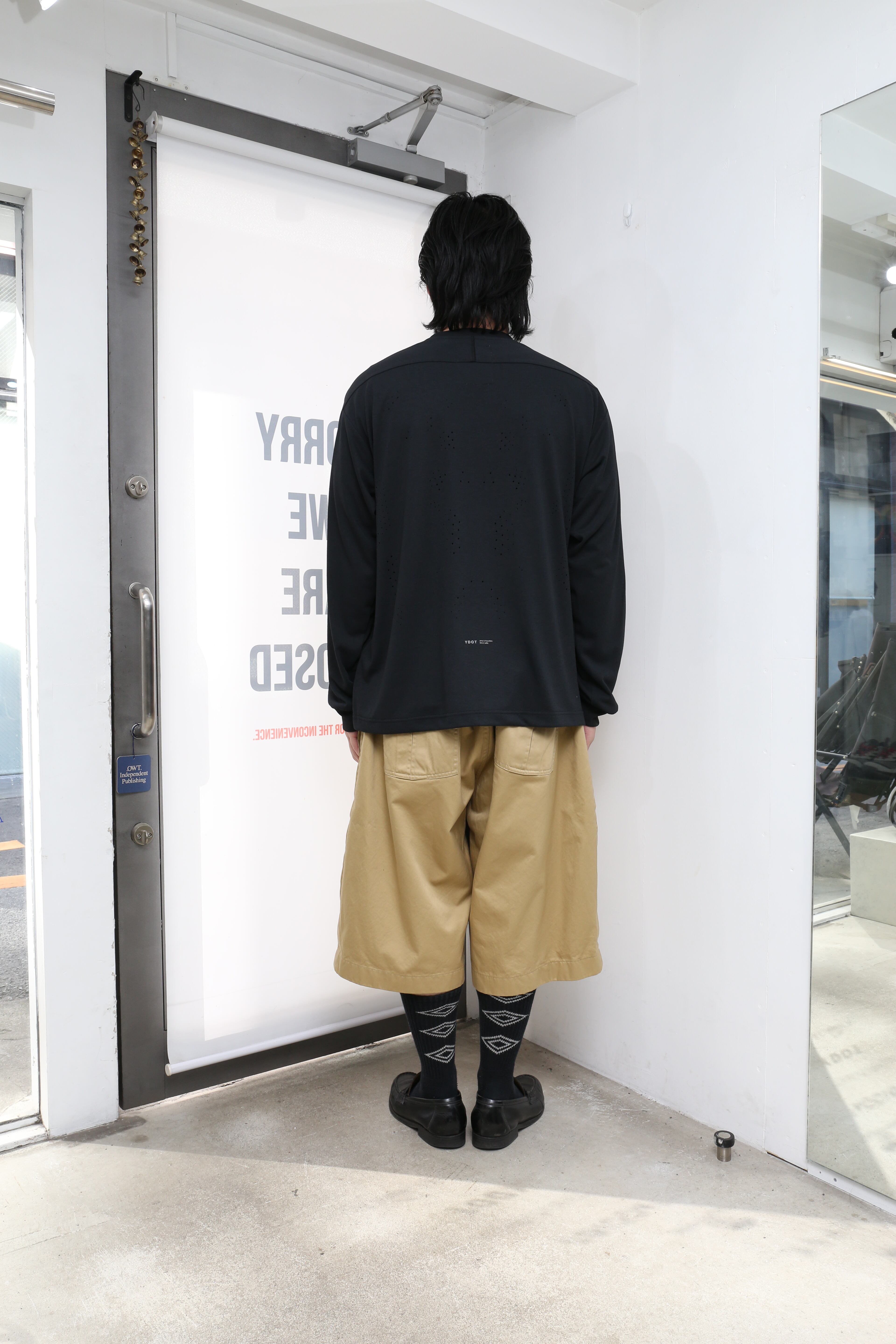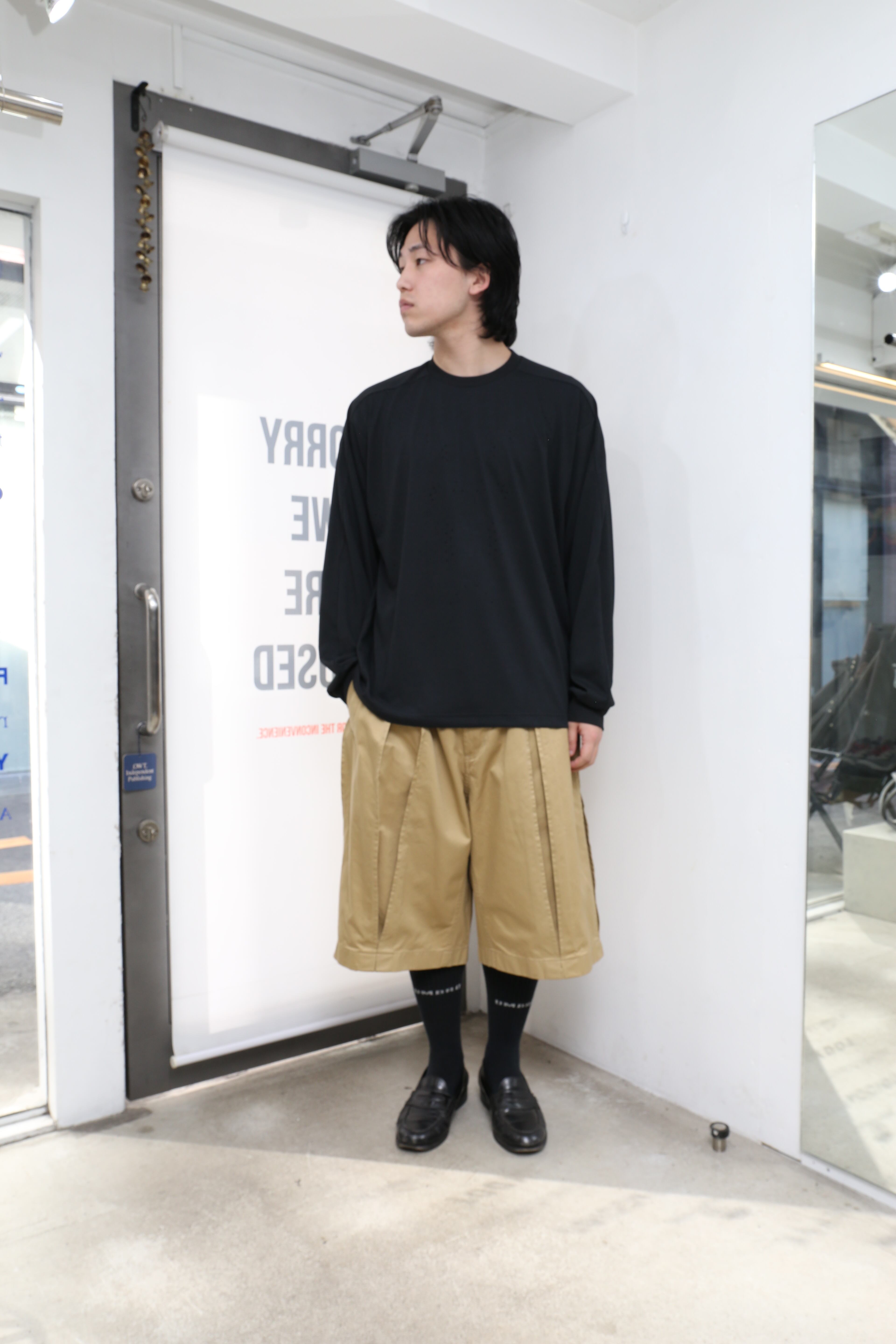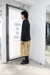 ヒップとワタリを大きく取ったワイドシルエットに合わせ、ウエストにはゴムを入れることで、裾までボリュームのあるシルエットに仕上げています。