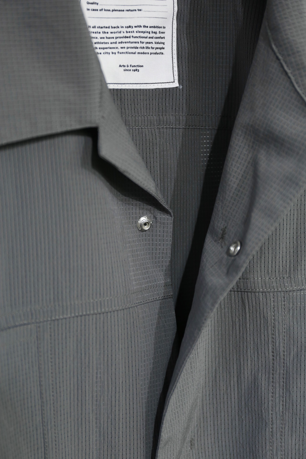 スナップボタンの比翼仕様により、すっきりとした見た目とスムーズな着脱を両立しています。